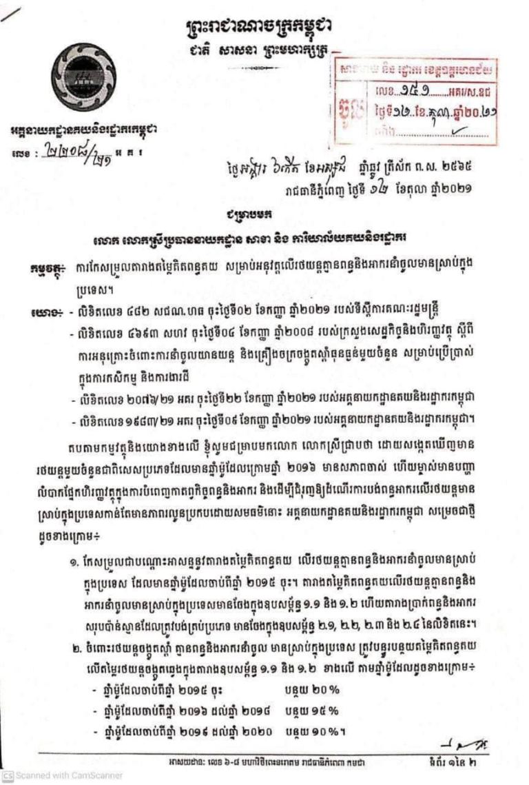 អគ្គនាយកដ្ឋានគយ និងរដ្ឋាករ បានចេញលិខិតសម្រេច កែសម្រួលតារាងតម្លៃគិតពន្ធគយ សម្រាប់អនុវត្តលើរថយន្តគ្មានពន្ធ និងអាករនាំចូល មានស្រាប់ក្នុងប្រទេស។