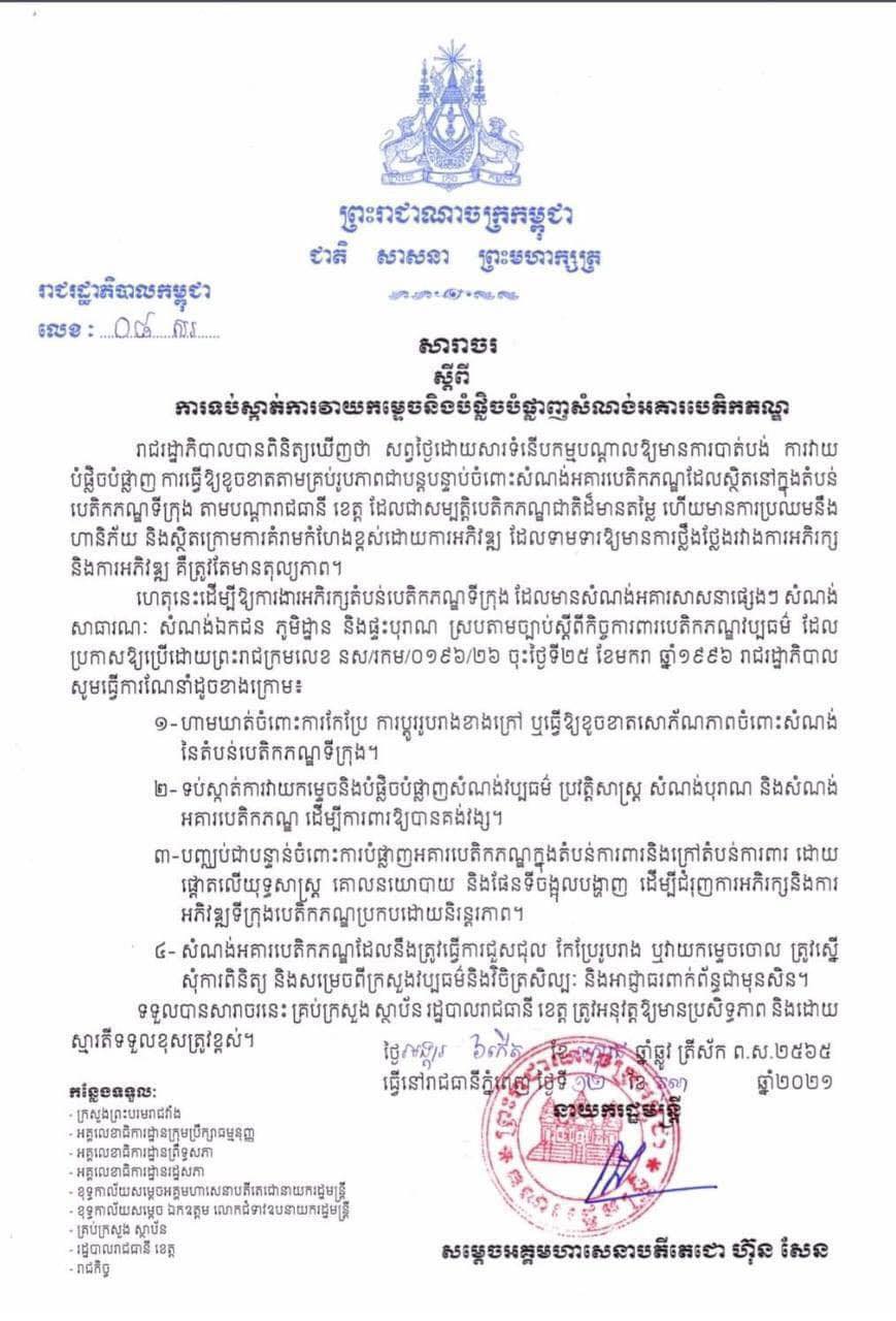 នៅថ្ងៃទី១៣ ខែតុលា ឆ្នាំ២០២១ សម្តេចអគ្គមហាសេនាបតីតេជោ ហ៊ុន សែន នាយករដ្ឋមន្ត្រីនៃព្រះរាជាណាចក្រកម្ពុជាបានចេញសារាចរមួយធ្វើការទប់ស្កាត់ការវាយកម្ទេច និងបំផ្លិចបំផ្លាញសំណង់អគារបេតិកភណ្ឌ។
