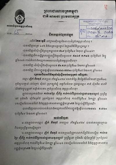 *ទី៨៖ ឈ្មោះ ឌួង ស៊ីបុណ្ណថុល ត្រូវបានចោទប្រកាន់ថាបានប្រព្រឹត្តិបទល្មើស គំរាមកំហែង សម្លាប់ ធ្វើឲ្យបាត់ជំនឿលើសេចក្តីសម្រេចរបស់តុលាការ ក្លែងឯកសារ ប្រើហិង្សាលើអ្នកកាន់កាប់អចលនវត្ថុដោយសុចរិត ញុះញ៉ង់ជាអាទិ៍ និងបង្កចលាចលដីធ្លីធ្វើឲ្យវឹកវរដល់អាជ្ញារធខេត្ត។