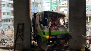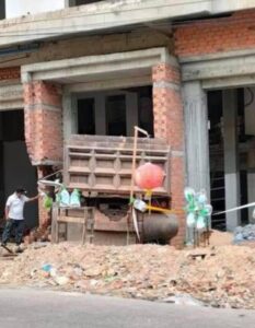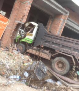 រថយន្តដឹកដី បើកចុះចំណោត ជ្រុលបុកចូលផ្ទះកំពុងសាងសង់ រងរបួសអ្នកបើកបរម្នាក់!