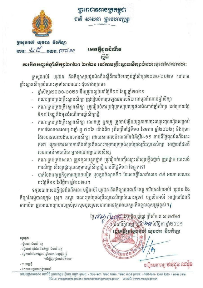 នៅរសៀលថ្ងៃនេះ ក្រសួងអប់រំ យុវជននិងកីឡា បានចេញសេចក្តីជូនដំណឹងស្តីពីការ ស្ដីពីការបិទបញ្ចប់ឆ្នាំសិក្សាឆ្នាំ២០២០-២០២១ នៅតាមគ្រឹះស្ថានសិក្សាចំណេះទូទៅសាធារណៈ ដោយនឹងធ្វើឡើងនៅថ្ងៃទី១៨ ខែធ្នូ ឆ្នាំ២០២១ខាងមុខ។