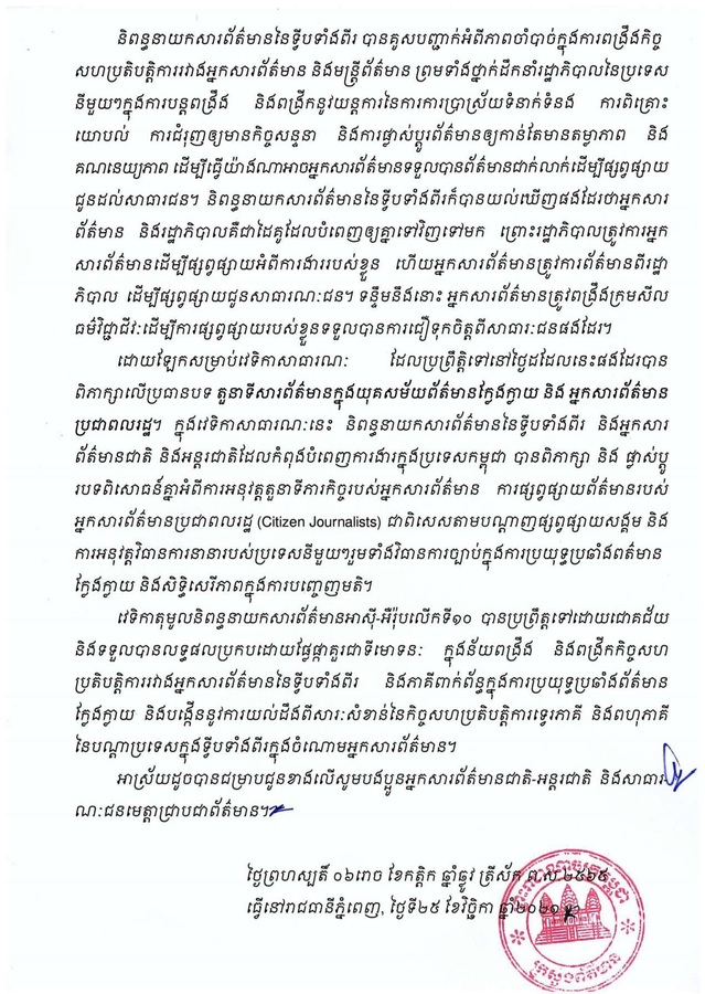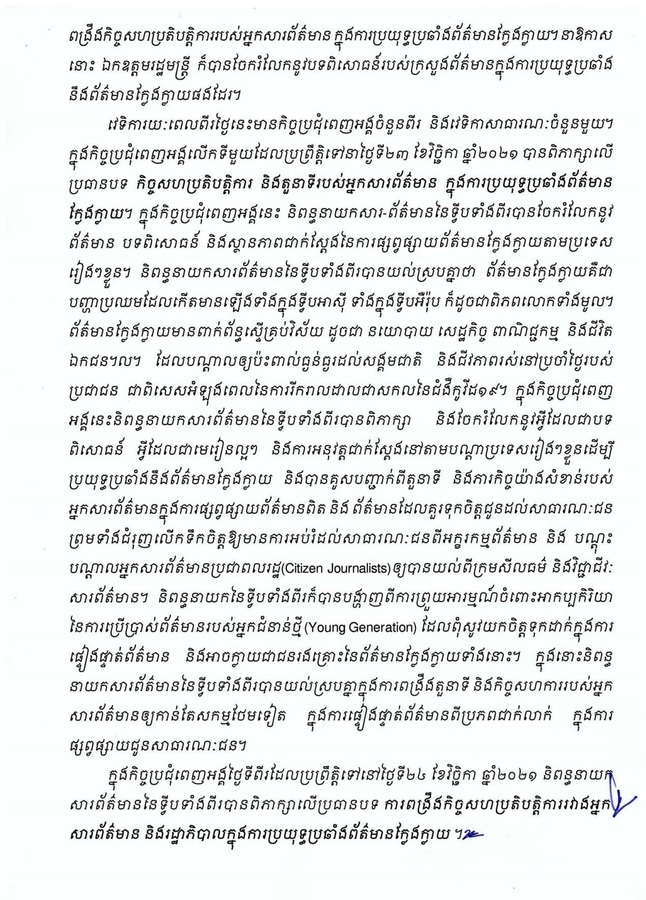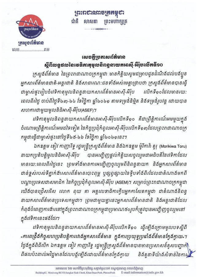 ក្រសួងព័ត៌មាន ចេញសេចក្តីប្រកាសព័ត៌មានស្តីពីលទ្ធផលនៃវេទិកាតុមូលនិពន្ធនាយក អាស៊ី-អ៉ឺរ៉ុប លើកទី១០ សុក្រ, 26 វិច្ឆិកា 2021 1:07 ល្ងាច 166 កំណត់ចំណាំចំពោះអ្នកបញ្ចូលមតិនៅក្នុងអត្ថបទនេះ៖ ដើម្បីរក្សាសេចក្ដីថ្លៃថ្នូរ យើងខ្ញុំនឹងផ្សាយតែមតិណា ដែលមិនជេរប្រមាថដល់អ្នកដទៃប៉ុណ្ណោះ។