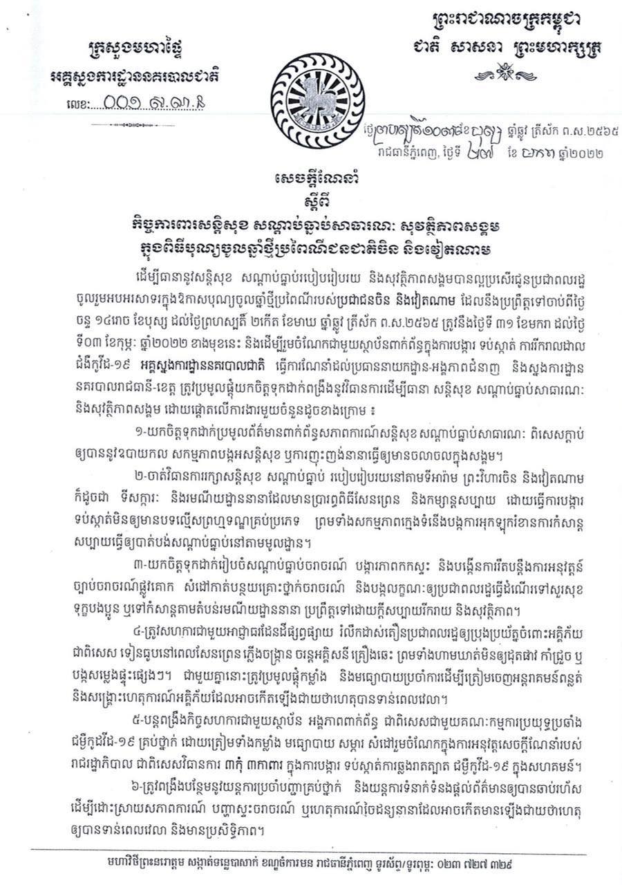 ខណៈដែលពិធីបុណ្យចូលឆ្នាំថ្មីប្រពៃណីរបស់ប្រជាជនចិន និងវៀតណាម នឹងប្រព្រឹត្តទៅចាប់ពីថ្ងៃទី៣១ ខែមករា ដល់ថ្ងៃទី៣ ខែកុម្ភៈ ឆ្នាំ២០២២ខាងមុខនេះ អគ្គស្នងការនគរបាលជាតិ បានធ្វើការណែនាំទៅដល់នាយកដ្ឋាន អង្គភាពជំនាញ និងស្នងការនគរបាលរាជធានីខេត្តទាំងអស់ ត្រូវយកចិត្តទុកដាក់ពង្រឹងនូវវិធានការដើម្បីធានាសន្តិសុខ សណ្តាប់ធ្នាប់សាធារណៈ និងសុវត្ថិភាពសង្គម។