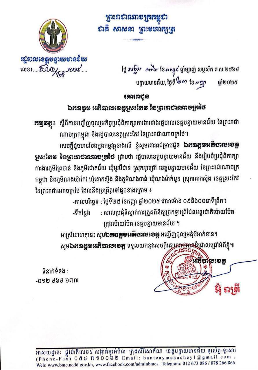 ឯកឧត្តម អ៊ុំ រាត្រី អភិបាលខេត្តបន្ទាយមានជ័យ បានស្នើឱ្យភាគីថៃចូលរួមជាមួយកម្ពុជា អនុវត្តឱ្យបានម៉ឺងម៉ាត់នូវស្មារតីនៃកិច្ចប្រជុំពិសេសគណៈកម្មាធិការព្រំដែនទូទៅ (GBC) នាថ្ងៃទី១០ ខែកញ្ញា ឆ្នាំ២០២៥ ចំណុច ៨.១ បានប្រគល់ភារកិច្ច ឱ្យខេត្តបន្ទាយមានជ័យរបស់កម្ពុជា និងខេត្តស្រះកែវរបស់ថៃ សម្របសម្រួលជាមួយគ្នា ដើម្បីគ្រប់គ្រងស្ថានការណ៍នៅទីតាំងផ្ទាល់ប្រកបដោយសន្តិវិធី រួមបញ្ចូលទាំងការបញ្ឈប់រាល់សកម្មភាពដែលពង្រីកទំហំវិវាទ និងបង្កើនភាពតានតឹង ដោយរង់ចាំដំណោះស្រាយរបស់គណៈកម្មការចម្រុះខណ្ឌសីមាព្រំដែនគោក (JBC) នៃប្រទេសទាំងពីរ។