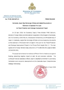 ពិធីចុះហត្ថលេខាលើលិខិតប្តូរសារ និងឯកសារពាក់ព័ន្ធស្តីពី ការផ្តល់ឥណទានសម្បទានប្រាក់យ៉េនរបស់រដ្ឋាភិបាលជប៉ុន បានធ្វើឡើងនៅថ្ងៃទី២៣ ខែមេសា ឆ្នាំ២០២៦ រវាងលោកឧបនាយករដ្ឋមន្ត្រី ប្រាក់ សុខុន រដ្ឋមន្ត្រីការបរទេស និង សហប្រតិបត្តិការអន្តរជាតិ នៃព្រះរាជាណាចក្រកម្ពុជា និងលោក UENO Atsushi ឯកអគ្គរាជទូតវិសាមញ្ញ និងពេញសមត្ថភាព នៃប្រទេសជប៉ុនប្រចាំកម្ពុជា។