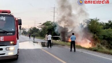 ងងុយមួយភាំង! រេចង្កូតរថយន្ត បុកគល់ឈើក្រឡាប់ផ្ទុះឆេះ នៅស្រុកពួក!